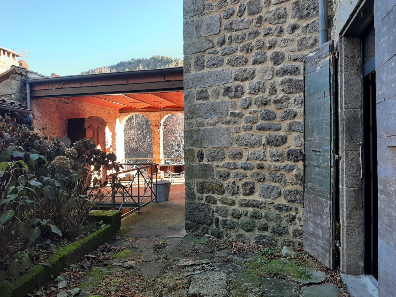 Édifiée autour d’une tour centrale, la bâtisse s’organise autour d’une cour intérieure avec terrasse couverte, conférant à l’ensemble un caractère architectural rare et authentique.
